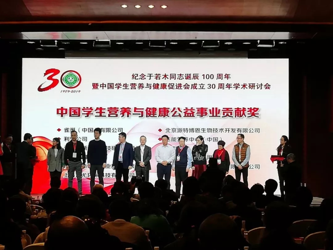 2019年1月12日,紀(jì)念于若木同志誕辰100周年暨中國(guó)學(xué)生營(yíng)養(yǎng)與健康促進(jìn)會(huì)成立30周年學(xué)術(shù)研討會(huì)在京舉行。 大會(huì)頒發(fā)了中國(guó)學(xué)生營(yíng)養(yǎng)與健康事業(yè)突出貢獻(xiàn)獎(jiǎng)、中國(guó)學(xué)生營(yíng)養(yǎng)與健康事業(yè)優(yōu)秀個(gè)人獎(jiǎng)、中國(guó)學(xué)生營(yíng)養(yǎng)與健康公益事業(yè)貢獻(xiàn)獎(jiǎng)等獎(jiǎng)項(xiàng)。其中,派特生物被大會(huì)授予“中國(guó)學(xué)生營(yíng)養(yǎng)與健康公益事業(yè)貢獻(xiàn)獎(jiǎng)”。