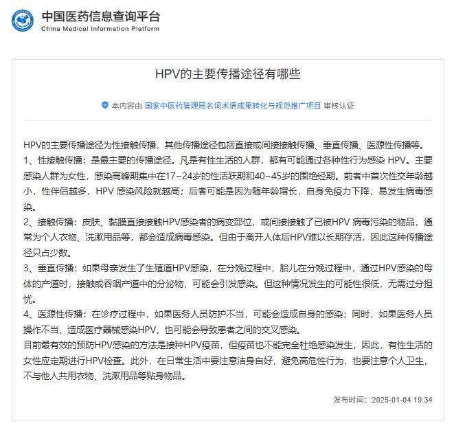 (?中國醫(yī)藥信息查詢平臺上關于HPV主要傳播途徑的介紹)
