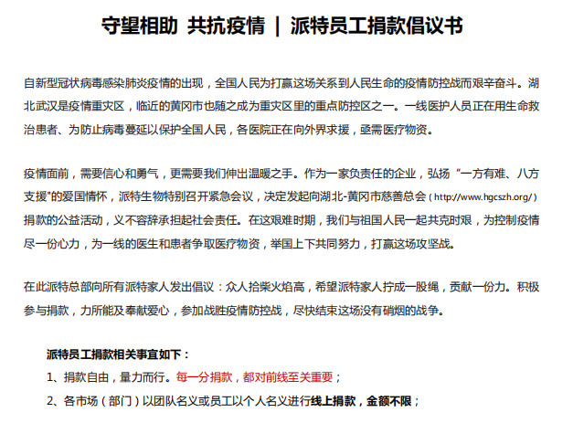 2月11日,派特公司通過黃岡市慈善總會(huì)向湖北黃岡市抗擊疫情捐款37萬(wàn)余元,全力支持黃岡市疫情防控工作。