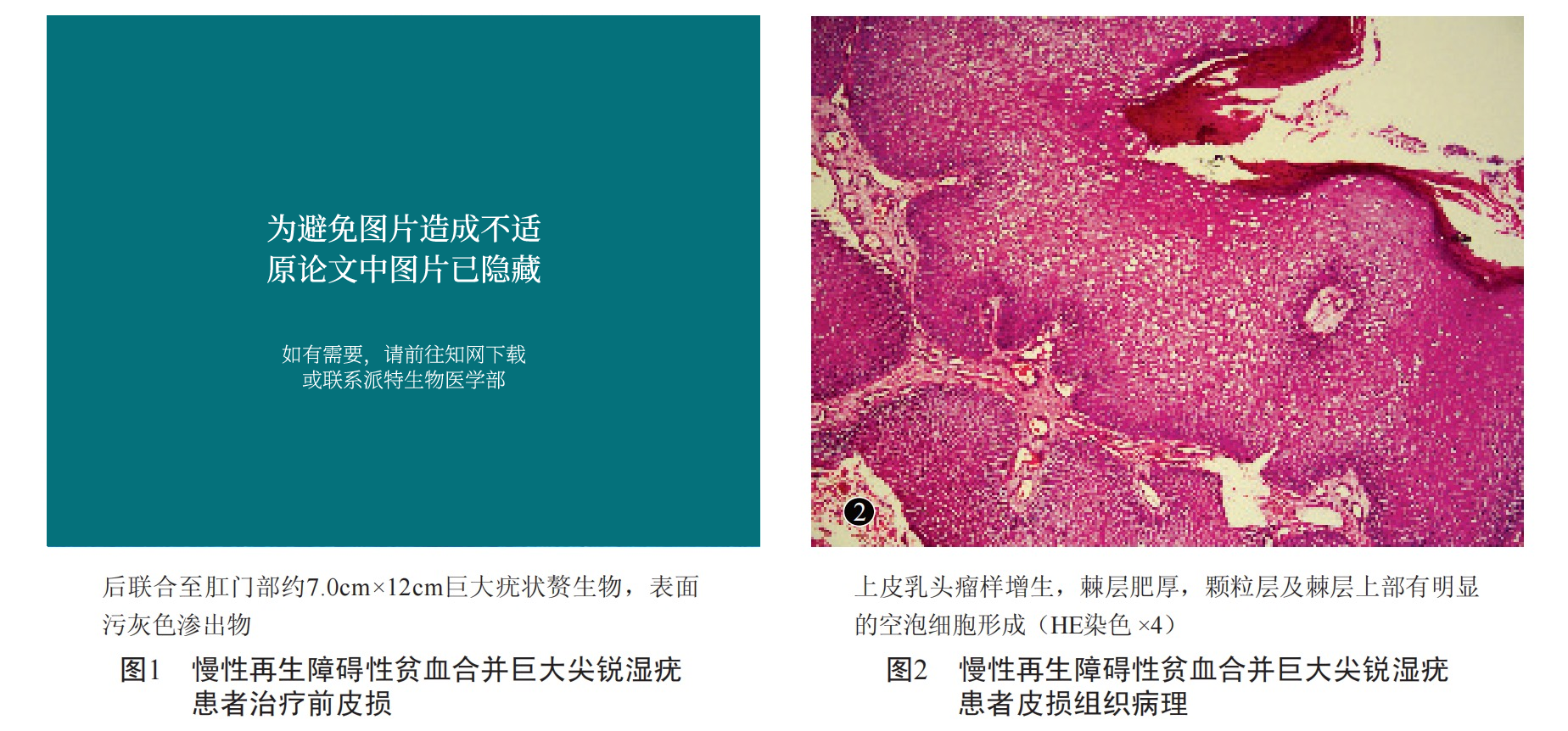 既往確診慢性再生障礙性貧血1年半,一直口服環(huán)孢素A200mg/d 治療,就診前3天查血常規(guī)白細(xì)胞正常,血紅蛋白及血小板輕度減低。否認(rèn)不潔性行為史,其配偶無尖銳濕疣病史。