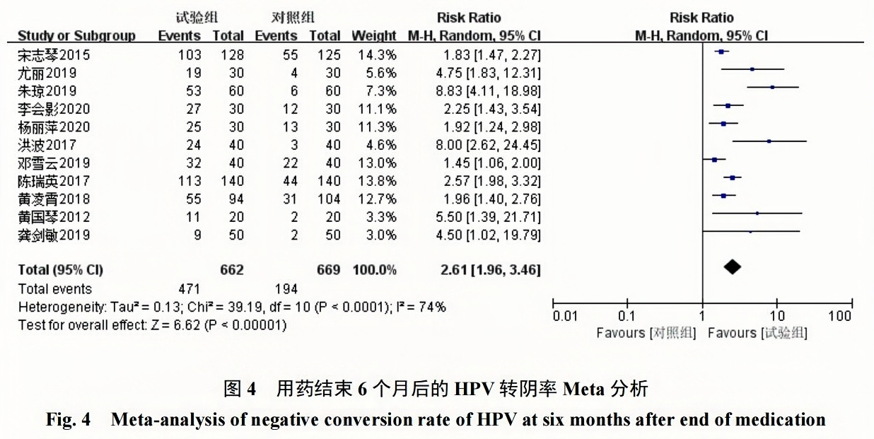 2組HPV轉(zhuǎn)陰率對(duì)比具有統(tǒng)計(jì)學(xué)意義 [RR=2.61,95% CI(1.96,3.46),P<0.00001]。見(jiàn)圖 4。