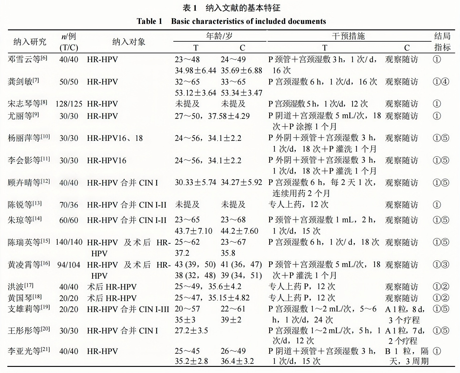 近年來(lái)中藥制劑廣泛用于HPV的清除治療?中醫(yī)學(xué)中,根據(jù)病毒感染后出現(xiàn)的臨床癥狀將其歸屬于“帶下病”范疇,認(rèn)為HPV感染病機(jī)不離“濕邪為患”又有”脾腎虧虛”“濕熱濕毒”從而導(dǎo)致“任脈損傷,帶脈失約”[4]?中藥制劑派特靈中含金銀花?大青葉?鴉膽子?苦參等清熱解毒燥濕及黃芪等扶正驅(qū)邪藥物,其優(yōu)點(diǎn)在于能提高細(xì)胞免疫,發(fā)揮免疫清除作用,有效清除HPV病毒[5]?運(yùn)用派特靈治療 HPV 感染的文獻(xiàn)報(bào)道證實(shí)其具有一定的療效,但尚缺乏對(duì)大樣本數(shù)據(jù)統(tǒng)計(jì)研究進(jìn)行高質(zhì)量的系統(tǒng)評(píng)價(jià),本研究對(duì)派特靈治療HR-HPV感染的RCT進(jìn)行Meta分析,以期為HR-HPV感染的臨床治療提供循證醫(yī)學(xué)證據(jù)?