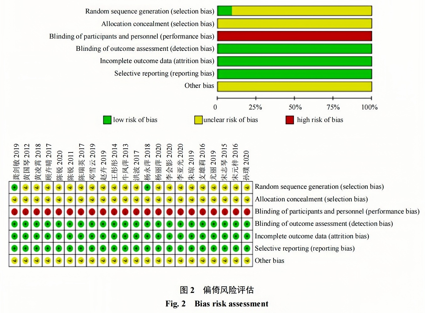 因納入的22項(xiàng)研究均無(wú)足夠信息明確是否存在高低偏倚,故均判定為未知風(fēng)險(xiǎn)。具體偏倚風(fēng)險(xiǎn)評(píng)估見(jiàn)圖2。