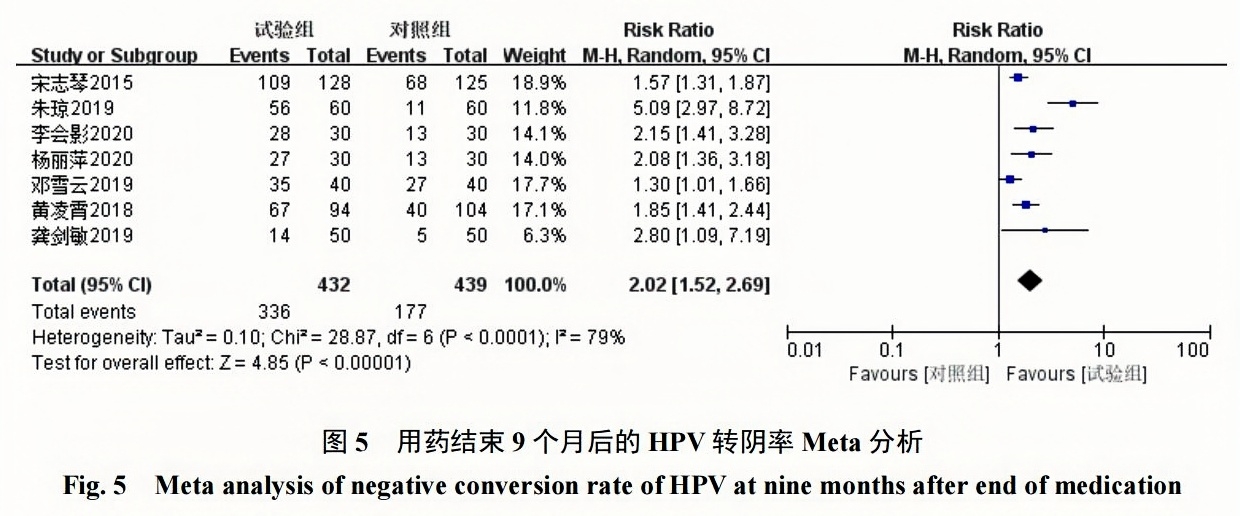2組HPV轉(zhuǎn)陰率對(duì)比具有統(tǒng)計(jì)學(xué)意義[RR=2.02, 95%CI(1.52,2.69),P<0.00001]。見(jiàn)圖5。