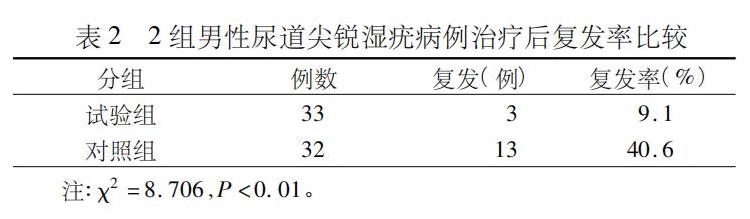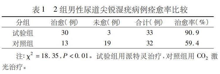 將65例男性尿道尖銳濕疣患者隨機(jī)分成派特靈治療試驗(yàn)組(33例)和CO2激光治療對照組(32例),隨訪3個月,比較2組的治愈率、復(fù)發(fā)率和不良反應(yīng)。
