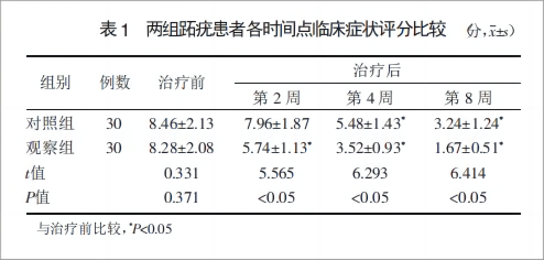 ③疼痛程度,劇烈疼痛 3 分,一般疼痛 2 分,微痛1分,無(wú)痛0分;記錄患者在治療前、治療第2周、第 4 周及第 8 周的癥狀評(píng)分,分?jǐn)?shù)越高表示癥狀越嚴(yán)重。