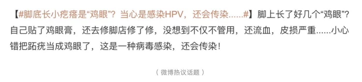 最近,微博上的一條熱搜引起了大家的關(guān)注——“腳底長(zhǎng)小疙瘩是“雞眼”?當(dāng)心是HPV!”。